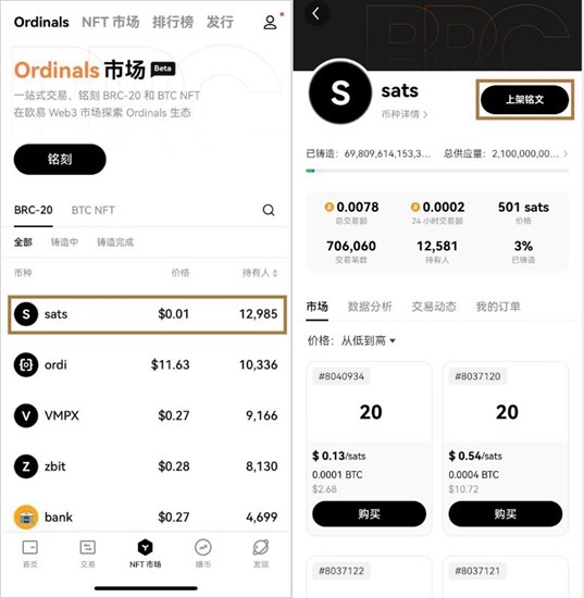 1. 访问OKX Ordinals市场页面,定位目标BRC20代币项目。进入资产详情界面后,点击功能栏中的【上架铭文】按钮启动交易流程