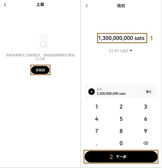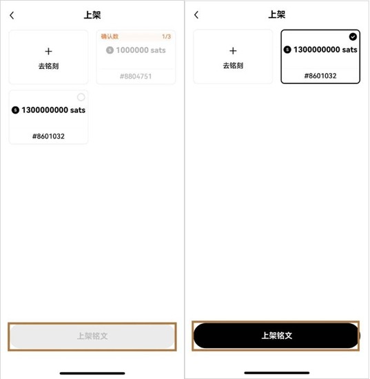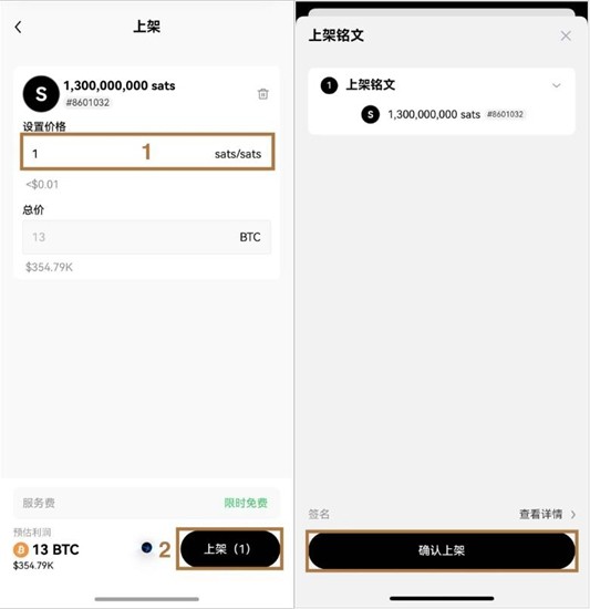 4. 完成区块链确认后返回交易界面,勾选已铸造的铭文资产。设置交易单价并核对总量,连续点击【上架】与【确认上架】完成最终挂单操作
