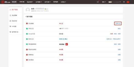账户安全验证第一步:登录ZB官方网站并进入个人中心,在账户管理界面定位"安全邮箱"模块。点击蓝色标注的"立即认证"按钮后,系统将引导用户进入身份核验环节。
