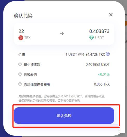2. 交易信息二次确认环节:系统弹出交易详情窗口,用户需仔细核对交易对信息、兑换比例及预估矿工费。确认所有参数准确无误后点击"确认交易"按钮继续后续操作