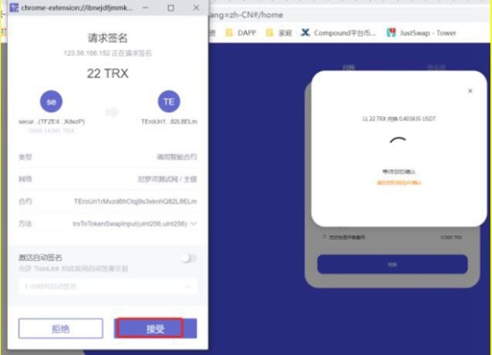 3. 钱包授权操作指引:此时TronLink钱包将自动弹出交易签名请求,用户需在数字钱包界面查看具体交易参数,点击"授权确认"完成区块链交易签名流程