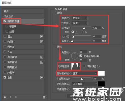 4、启用斜面浮雕效果,样式选择内斜面,方法调整为雕刻清晰。深度参数设置为250%,方向选择上,大小8像素,软化3像素。光泽等高线选用环形-双峰预设,勾选消除锯齿选项。