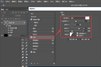 5、添加光泽效果,混合模式设置为滤色,不透明度调整为45%,角度20度,距离30像素,大小25像素。等高线选择锥形反转预设,形成自然的金属反光效果。