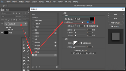 3、右键点击文字图层选择混合选项,进入图层样式设置界面。首先添加投影效果,混合模式设置为正片叠底,颜色选用深灰色(#2d2d2d),不透明度调整为65%,角度120度,距离8像素,扩展10%,大小12像素。