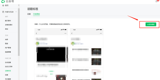 进入微信公众平台官网后,在左侧功能导航栏定位到「内容与互动」模块。点击展开二级菜单选择「话题与标签」选项,此时界面右侧会出现「页面模板」管理入口。首次使用的运营者需点击蓝色「添加模板」按钮初始化配置界面。