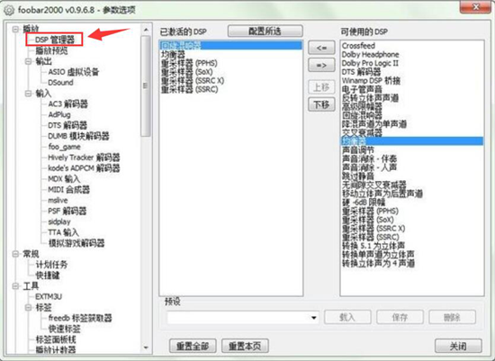 1. 启动程序后通过菜单栏进入参数设置界面,在播放分类中找到DSP管理器模块。右侧可用插件列表包含多种音效处理器,推荐优先加载回旋混响器、均衡器及四组重采样组件。