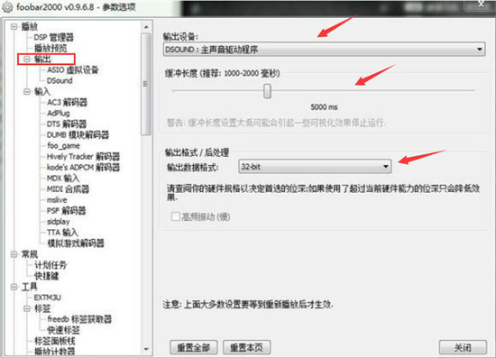 6. 在输出设备配置界面,建议优先选用WASAPI独占模式以获得最纯净的传输通道。当使用DSOUND驱动时,需将缓冲时长调整为1500ms以上,输出位深设定为32-bit浮点格式。