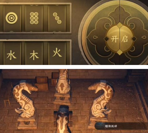 6、石板密码锁需输入特定组合:【163】配合属性顺序选择【水→木→火】