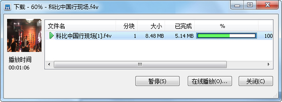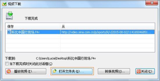 完成下载后软件将弹出交互式操作面板,用户可选择直接播放预览或进行格式转换。需注意F4V格式需使用专用播放器,推荐使用格式工厂等工具转换为MP4通用格式。