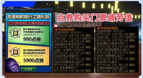 商城上架的两款限定礼包中,5900点券礼包内含30张门票及配套资源,适合追求快速成型的玩家;990点券周礼包则具备更高性价比,建议每周定期购入。需注意礼包产出的专属疲劳药与完美成长券可形成组合增益效果。