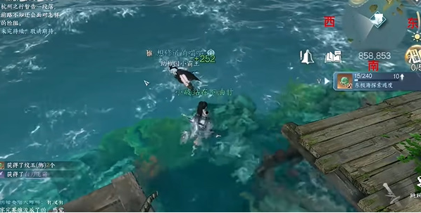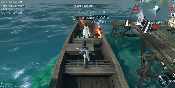 1. 首处宝箱位于水域东侧【847.857】坐标,停泊船只的甲板前端可见木质箱体,需注意船身晃动画面的物理效果;