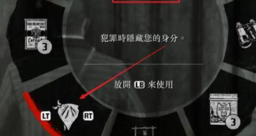 3、在围墙转角处激活物品轮盘,装备蒙面道具可避免身份暴露。此操作能有效规避后续的通缉风险