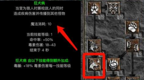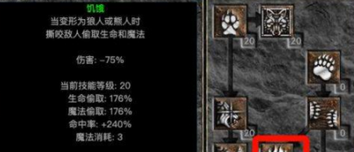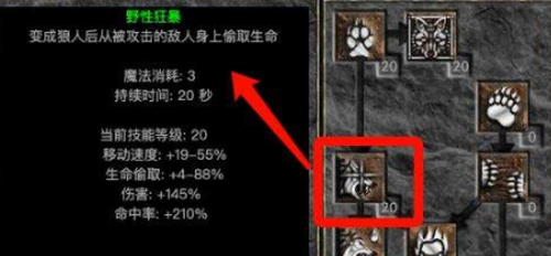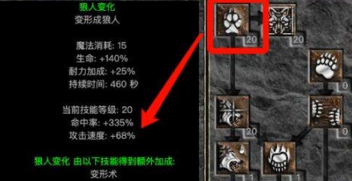 作为暴力狼流派的核心基础技能,狼人变化不仅提供形态转换功能,更直接影响变身后的基础攻击速度与移动能力。满级状态下可获得150%攻击速度提升,这是实现高频输出的关键保障。建议在角色等级达到6级后优先投入技能点。