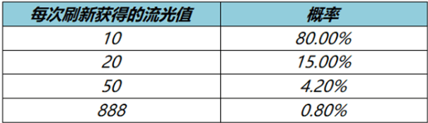 在限定活动中,每次消耗钥匙刷新奖励都会触发流光值累积机制。系统设定四个层级的数值奖励:10点(80%概率)、20点(15%概率)、50点(4.2%概率)以及稀有数值888点(0.8%概率)。需特别注意的是,当流光值总量达到阶段阈值时,可解锁更高级别的奖励池。