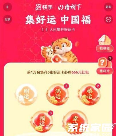 1、用户通过快手客户端首页入口进入"迎虎年分22亿"专题页面,在集好运卡牌专区可查看当前持有卡牌状态。活动界面采用动态生肖主题设计,用户每日可通过三次基础抽卡机会获取随机卡牌,其中幸运卡作为终极卡牌具有较低爆率。